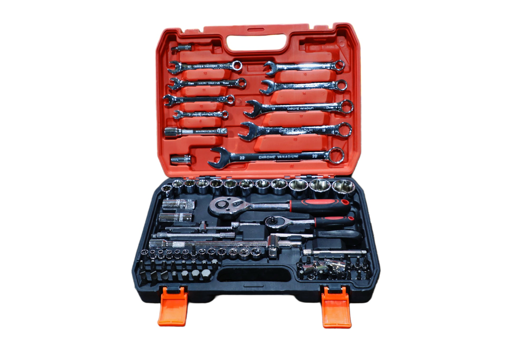حقيبة أدوات متكاملة تحتوي على 82 قطعة من المفاتيح، الرؤوس، المفكات، والملحقات الأساسية. مثالية للاستخدام المنزلي أو الورش، وتساعدك على إنجاز أعمال الصيانة بسهولة واحترافية