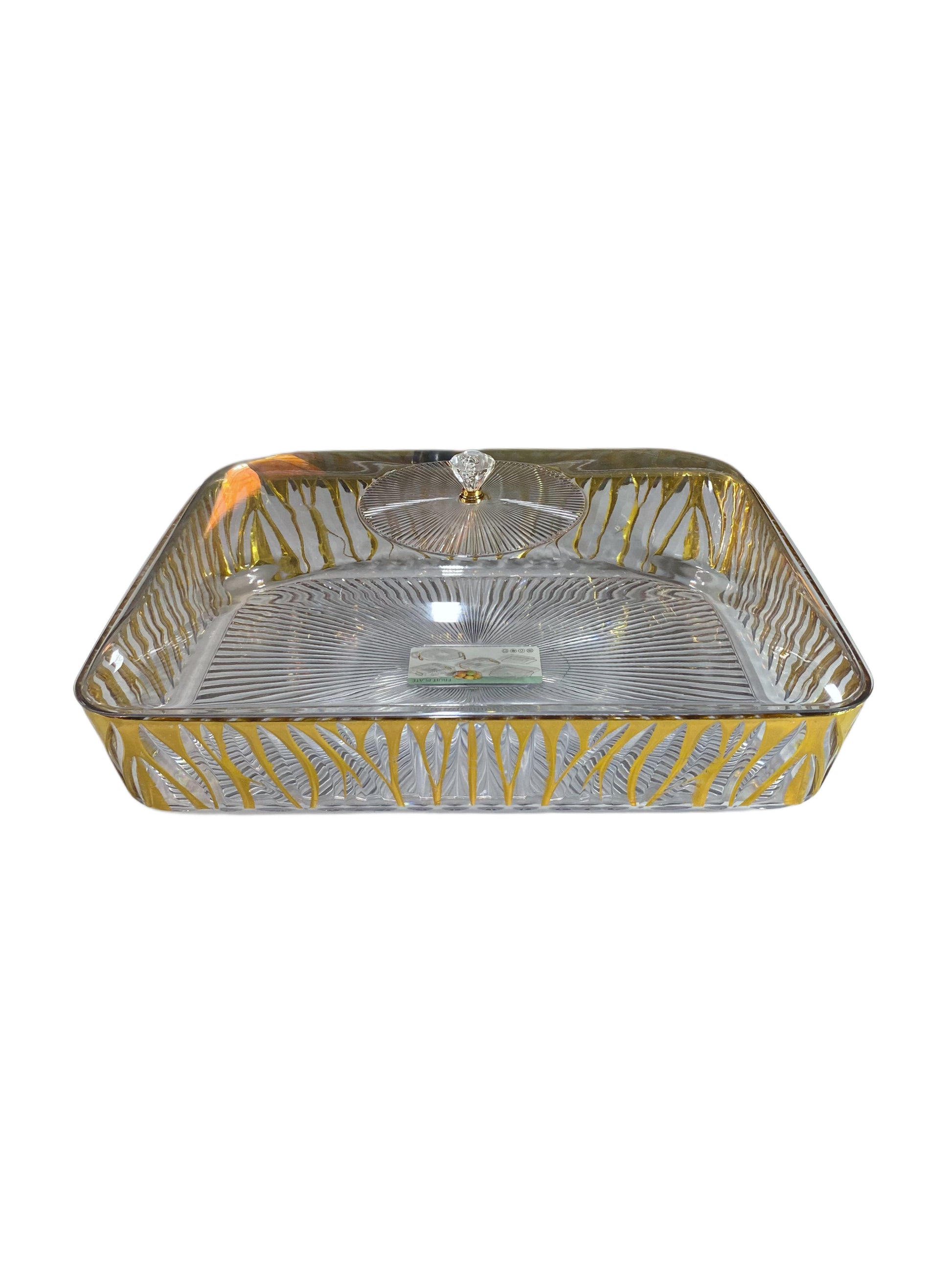 علبة تقديم مربعة مصممة من الكريستال الشفاف مع لمسات ذهبية أنيقة وغطاء محكم بمقبض فاخر. مثالية لتقديم التمر، الفواكه أو المكسرات على السفرة وتضيف لمسة فخامة وجاذبية لمناسباتك اليومية والضيافة