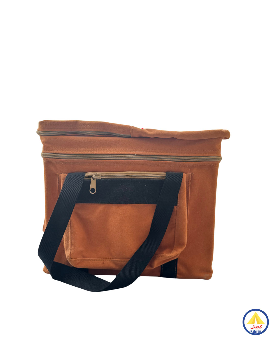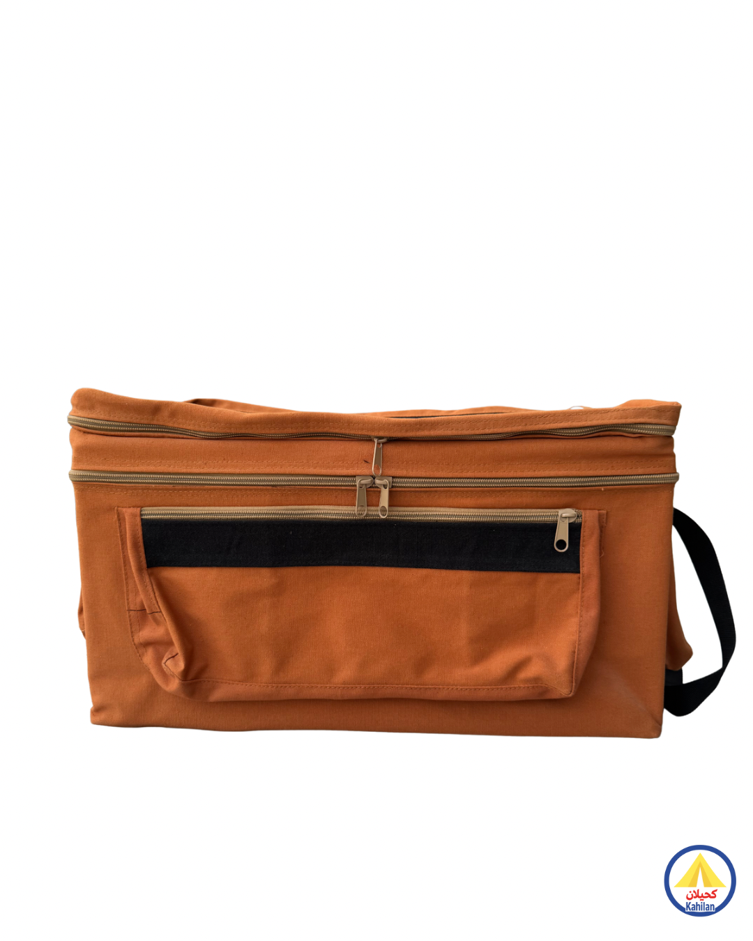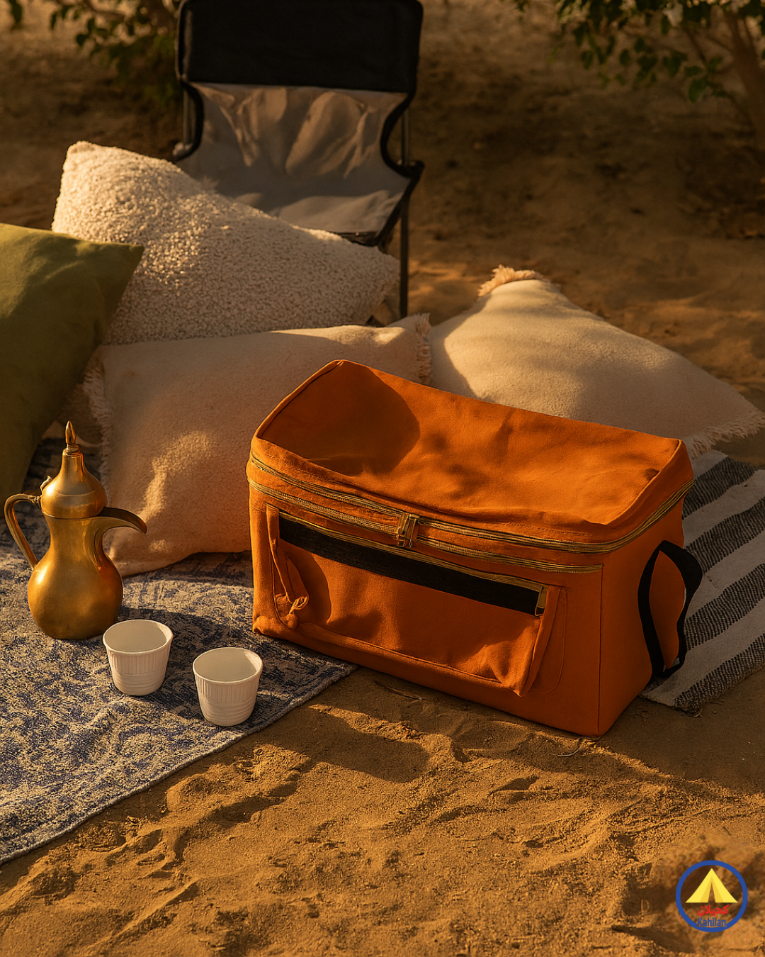 شنطة متينة وعملية بلون برتقالي جذاب، بسعة واسعة وجيب أمامي بسحاب لحفظ كل أغراضك من دلال وفناجيل وأدوات القهوة والشاي. مثالية للبر والبحر والطلعات، سهلة الحمل بحزام قوي ومريح
